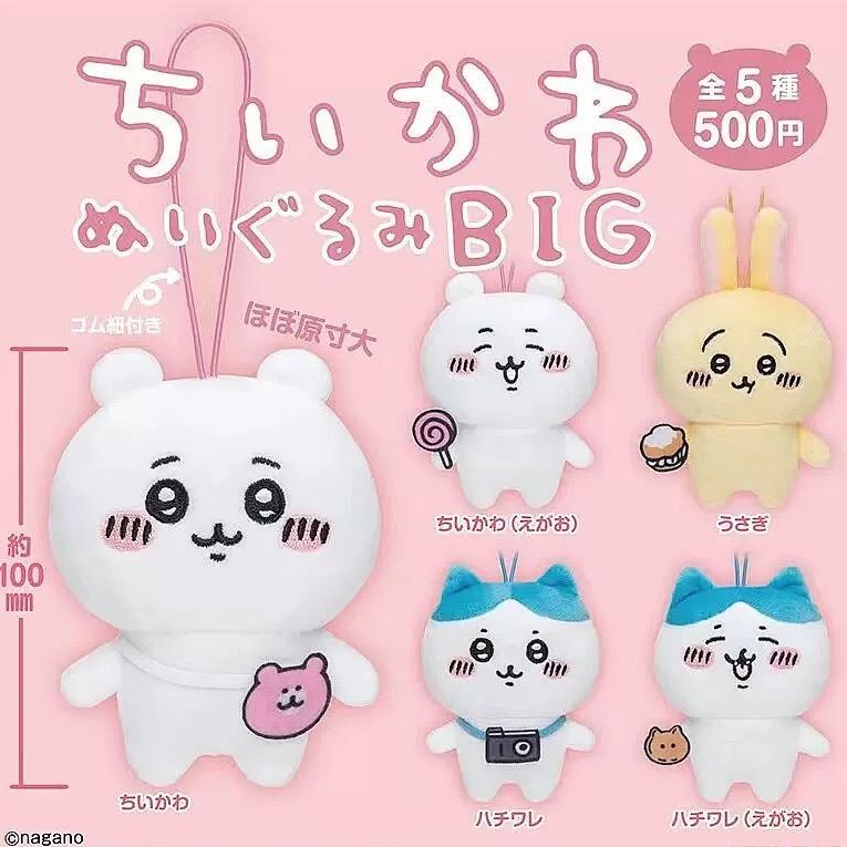 Product Specifications: Brand: KITAN CLUB IP: Chiikawa Series: Chiikawa Nuigurumi BIG Material: Polyester (Body), Polyurethane (Elastic Strap) Type: Capsule Toy (Gashapon) Size: